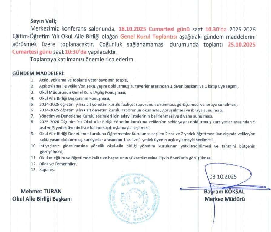 18 EKİM 2025 TARİHİNDE YAPILACAK 2025-2026 ÖĞRETİM YILI SENE BAŞI OKUL AİLE BİRLİĞİ OLAĞAN GENEL KURUL DAVETİYESİ